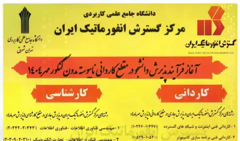 ثبت نام دانشگاه علمی و کاربردی مرکز گسترش انفورماتیک ایران در یازده رشته و در مقاطع کارشناسی و کاردانی ناپیوسته آغاز شد. متقاضیان میتوانند تا پایان روز یکشنبه 24 شهریورماه